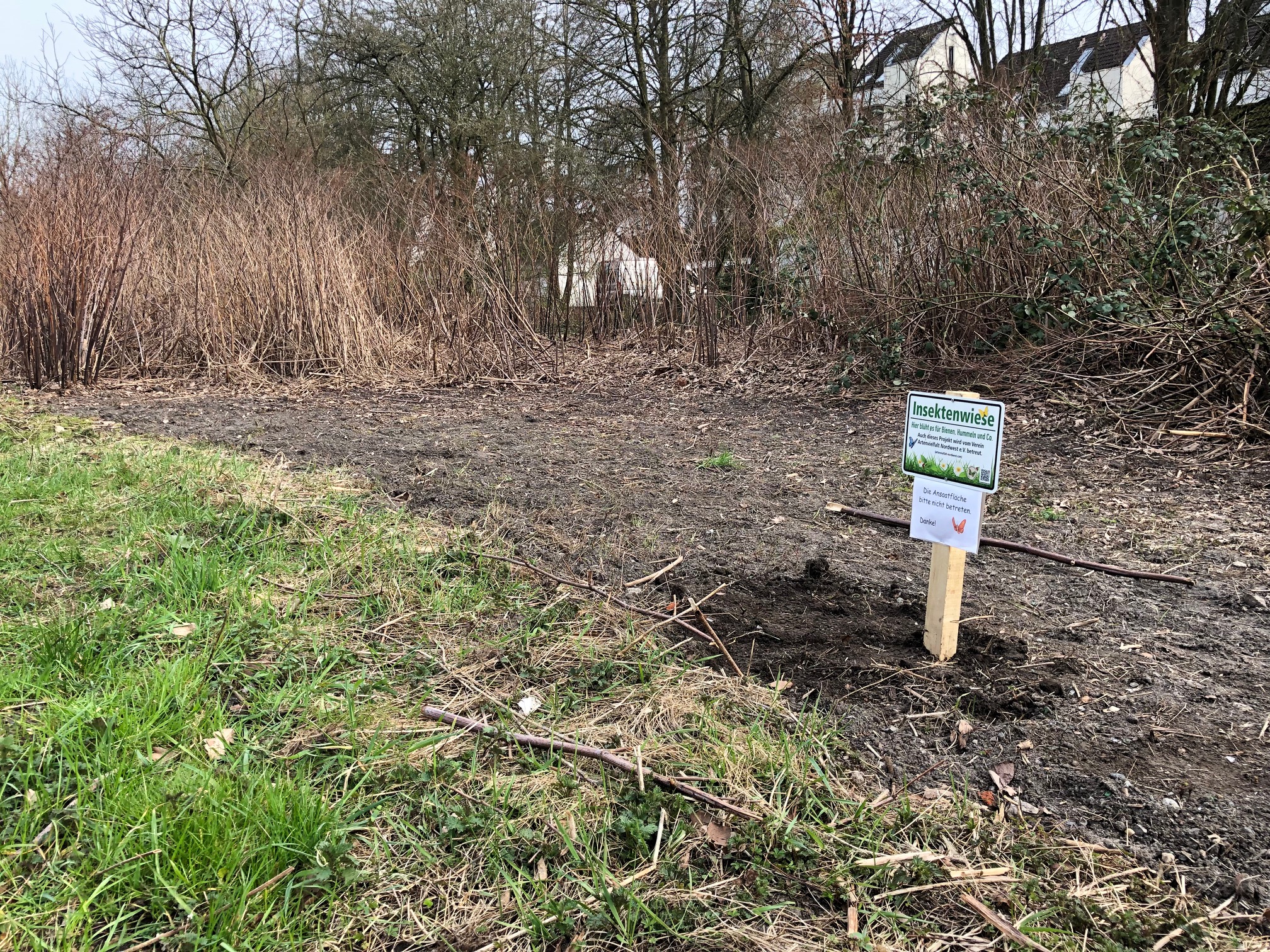 Mit großem Aufwand wurde im Februar `26 auf einer Fläche von ca. 300 m² die vorjährigen Sprosse und die reich verzweigten Wurzelteile der Staude gerodet. Da sich einerseits auf der Fläche erfahrungsgemäß auch in den folgenden Jahren wieder aufwachsende Knöterichsprosse aus verbliebenen Wurzelstücken entwickeln werden und andereseits zahlreiche, für eine Blühwiese ungünstige Krautarten wie Brennnessel und Ampfer aufkeimen werden, wird über die gesamte Vegetationsperiode 2026 der Boden frei von Aufwuchs gehalten. Lediglich ein schmaler Streifen wurde probeweise mit einer Ansaatmischung u.a. mit einjährigen Kräutern wie Mohn und Kornblume angesät. Die restliche Fläche wir erst im Herbst `26 mit einer artenreichen Wiesenmischung aus regionalen Arten angesät.